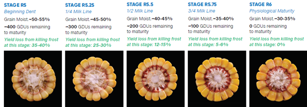 Kernels accumulate dry matter from the day of pollination (R1) to physiological maturity (R6 this is often referred to as Black Layer). The table below tracks reproductive growth stages from days after tassel/silking and the approximate moisture at that stage.