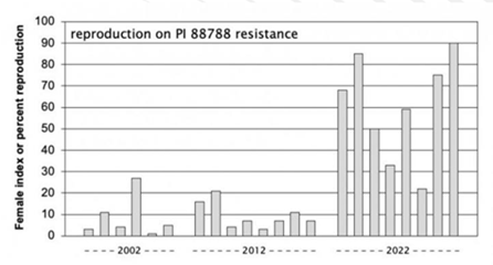 A preponderance of soybean lines today carry SCN tolerance and specifically PI88788 resistance. This has been a useful trait for years and continues to have utility. However, as with any trait, repeated use can put stress or selection pressure on the native populations of the pest. In a sense, “sorting or selecting those individuals out of millions that may be tolerant.” We are beginning to see this with PI88788 and the ability of SCN to repopulate on soybean roots with this trait.
