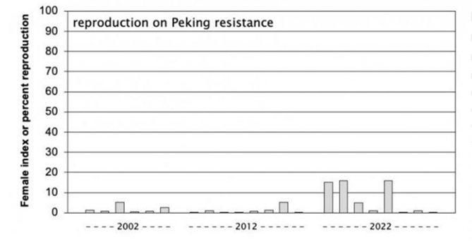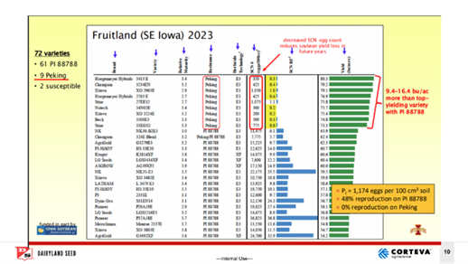 Iowa State has great data on the reproduction of SCN on soybean roots. (See the graphs below.) Notice the exponential increase in reproduction on PI88788 versus Peking over the past 20 years. Item three shows the yield performance of Peking lines (Dairyland does not market in that area, however, other Corteva other brands are represented) and in the yellow rectangle in the lower right corner you can reference the percent reproduction.