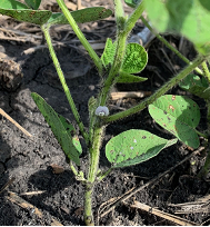 The photo above shows a soybean plant in the R2 growth stage which is Full Bloom when an open flower is on one of the two uppermost nodes on the main stem. Peak flowering occurs at Beginning Pod development (R3), with flowering continuing until Beginning Seed (R5) or shortly thereafter. Soybean plants will flower and put on vegetative growth at the same time. Not every flower or blossom will produce a pod, in fact, it is not unusual for soybeans to abort 60 to 70 percent of their flowers. The issue with aborted flowers besides reduced yield potential, is that it provides an opening for a fungus Sclerotinia sclerotiorum (which causes white mold) to enter the plant.