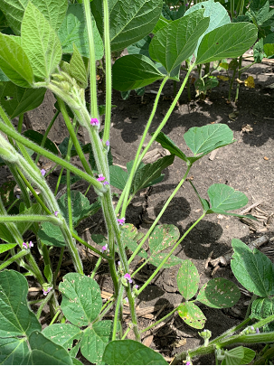 Most soybeans fields around the area are entering the flowering stages. Soybean plants can start the flowering process from V2 -V8 (2nd to 8th Trifoliolate), and with early planting dates can start flowering prior to Summer Solstice. Other factors such as drought stress can induce plants into flowering. Conversely, soybeans that are planted early and have good fertility are also more prone to flowering early. Once a soybean plant starts to flower, it is in the Reproductive phase or R1 which is Beginning Bloom when one open flower on any node on the main stem, which is shown below.