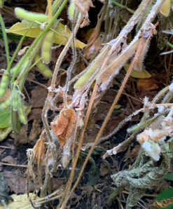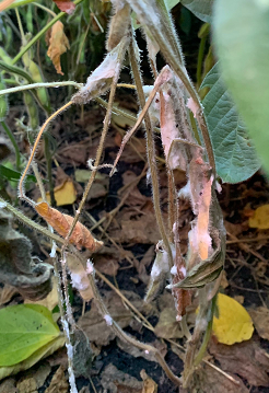 The white mold fungus, Sclerotinia sclerotiorum, primarily infects the soybeans through senescing flowers around the R1-R3 (first flower – beginning pod) stage. Conditions that usually create favorable conditions for white mold are lower than normal temperatures (below 85°F) and above average precipitation or high humidity around the time of flowering. Symptoms don’t usually appear until the R4-R6 (full pod – full seed) growth stages. Foliar symptoms are interveinal coloring of grey-green and can resemble other soybean diseases such as brown stem rot or stem canker. Fluffy white mycelium growth can be found on the stems near the nodes. Leaves of infected plants eventually die but remain attached to the stem.