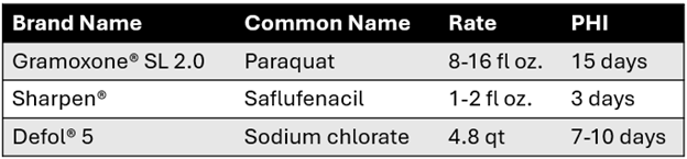 With delayed or uneven emergence, we can see uneven senescence, or ripening of soybeans, which can delay harvest and allow for early senescing soybeans to become too dry by the time the later senescing soybeans are ready for harvest. Heavy weed pressure can impact the harvestability of soybeans. As the soybeans senesce, the weeds can stay green. The added green vegetation is hard for combines to cut and process. Each of these situations could benefit from a harvest aid or desiccation. The application of herbicide or salt to defoliate later to senesce soybeans or terminate weeds in fields with heavy weed pressure.