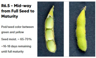 R6.5 timing is important because the soybean is no longer attached to the plant and the seeds will begin to mature normally regardless of the condition of the plant foliage. Application of a desiccant or harvest aid before this stage can impact seed size and maturation.